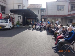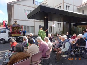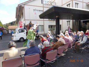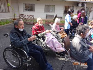 デイサービス、ケアハウス、特養の利用者の皆様が玄関前で出迎えました。