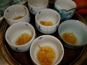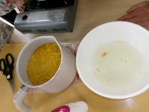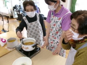 利用者さんからたくさんのゆずを頂きました。栄養士さんと相談してカラオケ喫茶の時間にゆず茶を振る舞うことになりました。まず利用者さんに手伝っていただき、ゆずジャムを作りました。細かく皮を刻み、果汁もたっぷり絞り甘酸っぱく美味しいジャムが出来ました。湯呑みにたっぷりジャムを入れてお湯で割ってゆず茶の完成です。