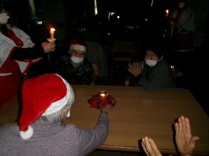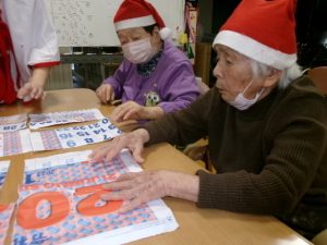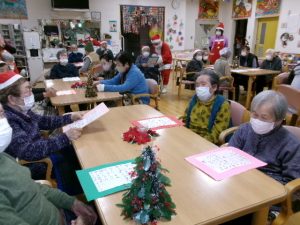12月19日から25日までデイサービスでクリスマス会を開催しました♪ キャンドルサービスからスタート!職員によるハンドベル演奏を聴いて、クリスマスの雰囲気を存分に感じていただきました。その後、皆さんでクリスマスソングを合唱しました。マイクで歌ってくださる方もおり、とても盛り上りました。 ゲームではキラキラ豆拾いゲームやカレンダーパズル、連想ビンゴゲーム、ジェスチャーゲームを楽しみました。クリスマスプレゼントは毎日日替わりのデコレーションケーキ盛り合わせでした。たくさん楽しんで、たくさん食べて、思い出に残るクリスマス会でした。