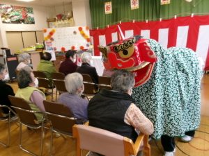 グリーンヒル名物の獅子舞さんに頭をカプっと噛みついて(神ついて)もらい、利用者さんも手を合わせてご満悦でした。
