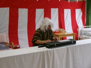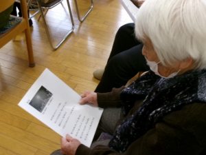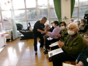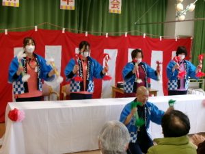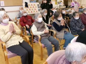その後は職員による、銭太鼓や歌謡曲「祝い船」の披露がありました。大正琴の演奏では、琴の音色に合わせて皆さんで歌も歌いました。